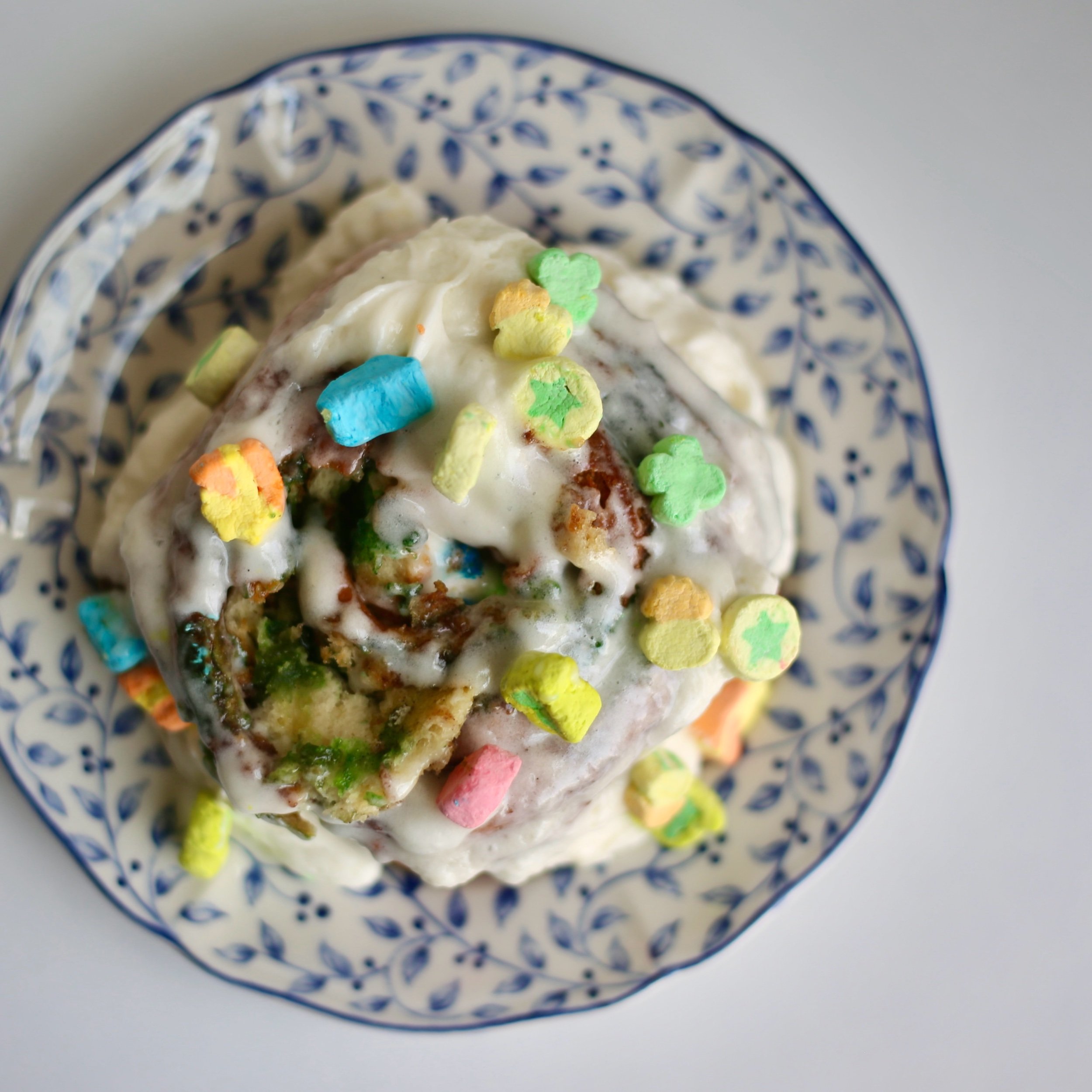 Soft cinnamon roll dough rolled out and filled with brown sugar cinnamon filling, Lucky Charms marshmallows, and ground cereal. Baked until golden, topped with vanilla cream cheese icing, and finished with even more Lucky Charms marshmallows.